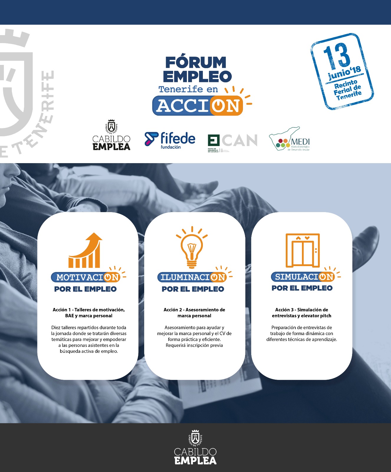 El Fórum Empleo Tenerife en Acción está organizado por el área de Empleo del Cabildo y cuenta con el apoyo de la Fundación Insular para la Formación, el Empleo, el Desarrollo Empresarial (Fifede), el Fondo de Desarrollo de Canarias (Fdcan) y el Marco Estratégico de Desarrollo Insular (MEDI) del Cabildo.