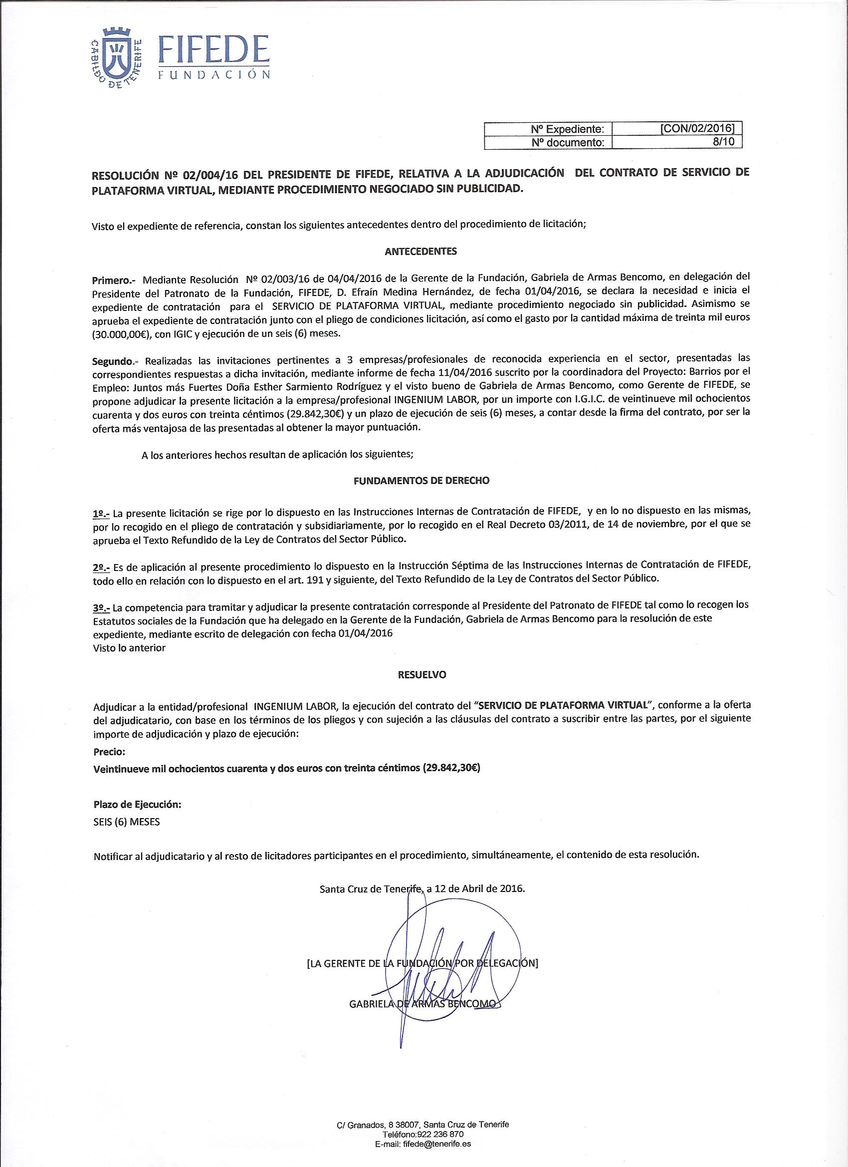 | Concepto | Contrato para realización de un servicio de plataforma virtual |